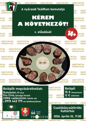 A Csemadok csütörtöki alapszervezete szeretettel vár mindenkit a Kérem a következőt! című előadásra.