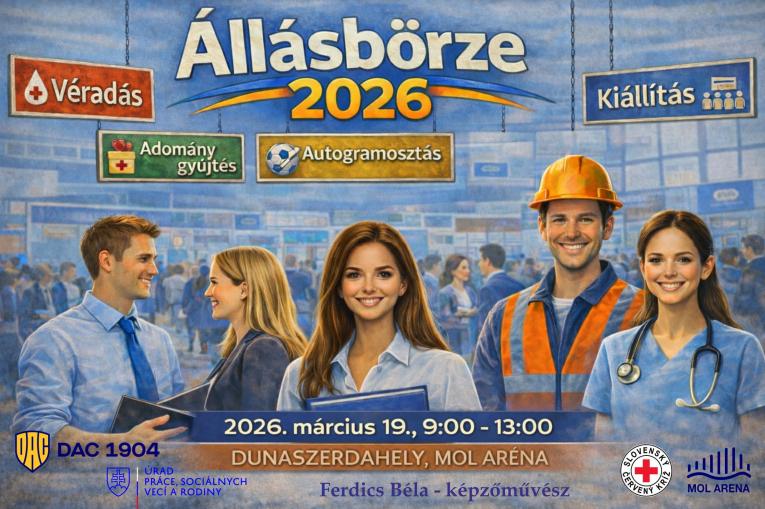 Tisztelt Polgárok!A dunaszerdahelyi Munkaügyi, Szociális és Családügyi Hivatal tájékoztatja Önöket, hogy 2026-ban Állásbörzétszervez, amelyen a kerület és a tágabb környék legnagyobb munkaadói vesznek részt.A rendezvényre a dunaszerdahelyi MOL Aréna (VIP Silver) területén kerül sor 2026. március 19-én 9:00 és 13:00 óra között.Az Állásbörzén véradásra is lehetőség nyílik a dunaszerdahelyi Kórház és Poliklinika Hematológiai és Transzfúziós Osztályával együttműködve 8:00 és 11:00 óra között.A rendezvényen egy jótékonysági rendezvényre, a Dýchaj sám polgári egyesület javára szervezett közgyűjtésre is sor kerül. A polgári egyesület a HC Dunajská Streda csapatát támogatta a hivatalos klubmezzel, amelyet a kézilabda-csapat játékosai írtak alá, valamint az FC DAC Dunajská Streda csapatát a csapatmezzel, amelyet a labdarúgó-csapat játékosai és Ferdics Béla üvegművész adományozott, akik egy műalkotást adományoztak.Az adományozott tárgyakat a közgyűjteménybe hozzájárulók között sorsoljuk ki.Arra kérjük Önöket, hogy amennyiben lehetőségük van rá, aktívan támogassák mind a véradást, mind jótékonysági rendezvényünket.