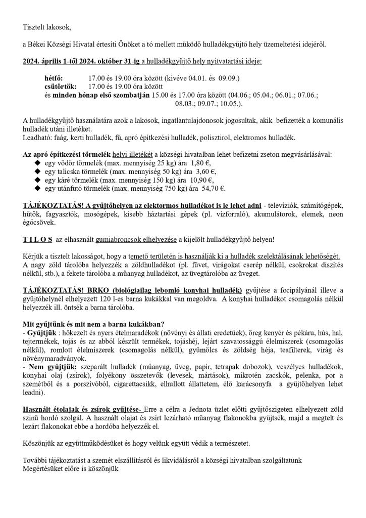 A béke-i gyűjtőhely nyitvatartási ideje_2024.