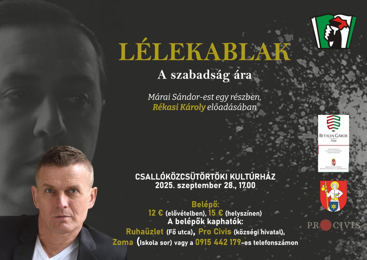 Miestna organizácia Csemadok Štvrtok na Ostrove pozýva na divadelné predstavenie Lélekablak v nedeľu, 28. septembra, o 17:00 do kultúrneho domu vo Štvrtku na Ostrove. Lístky sú dostupné vo Štvrtku na Ostrove, v poľovníctve Zoma, v textilnom obchode na hlavnej ulicy a v kancelárii Pro Civis, respektíve na telefónnom čísle 0915 442 179.
