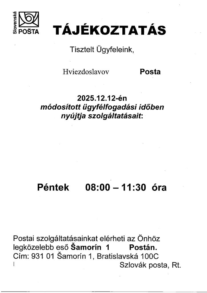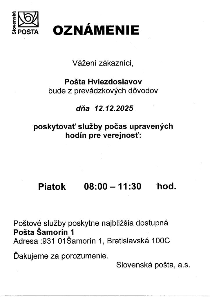 Pošta Hviezdoslavov - zmena prevádzkových hodín 1