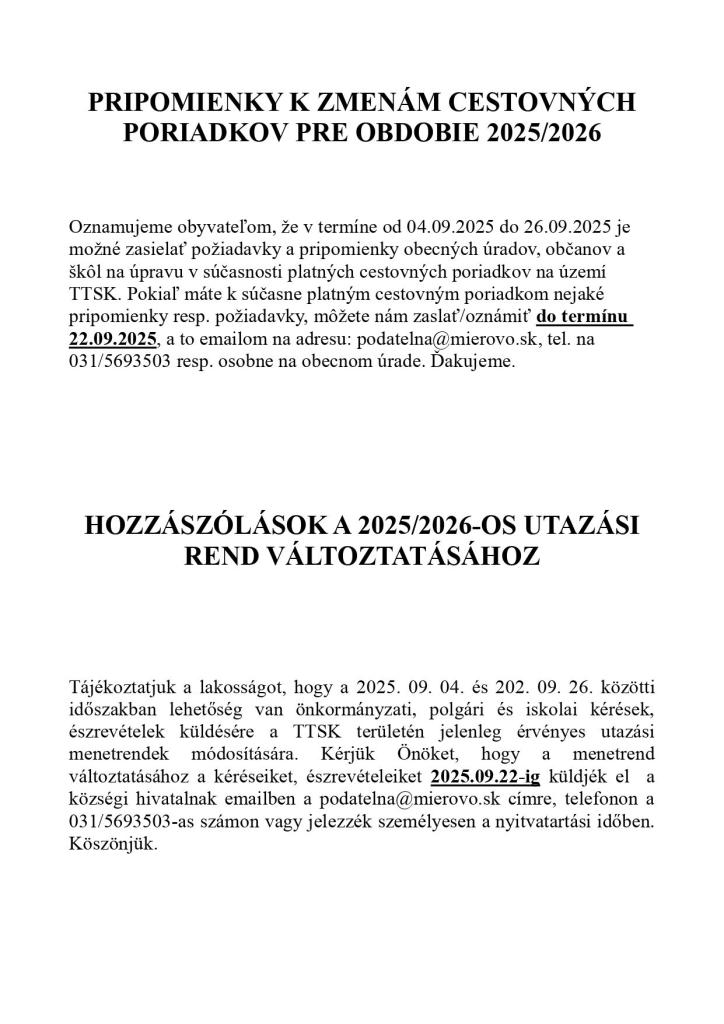v súvislosti s prípravou cestovných poriadkov prepravcu SAD Dunajská Streda, a.s. a ARRIVA Trnava, a.s. pre obdobie 2025/2026 si Vás dovoľujeme informovať, že pokiaľ máte k súčasne platným cestovným poriadkom týchto prepravcov nejaké pripomienky resp. požiadavky, aby ste nám tieto zaslali/oznámili do termínu 22.09.2025, a to emailom na adresu: podatelna@mierovo.sk, tel. na 031/5693503 resp. osobne na obecnom úrade.