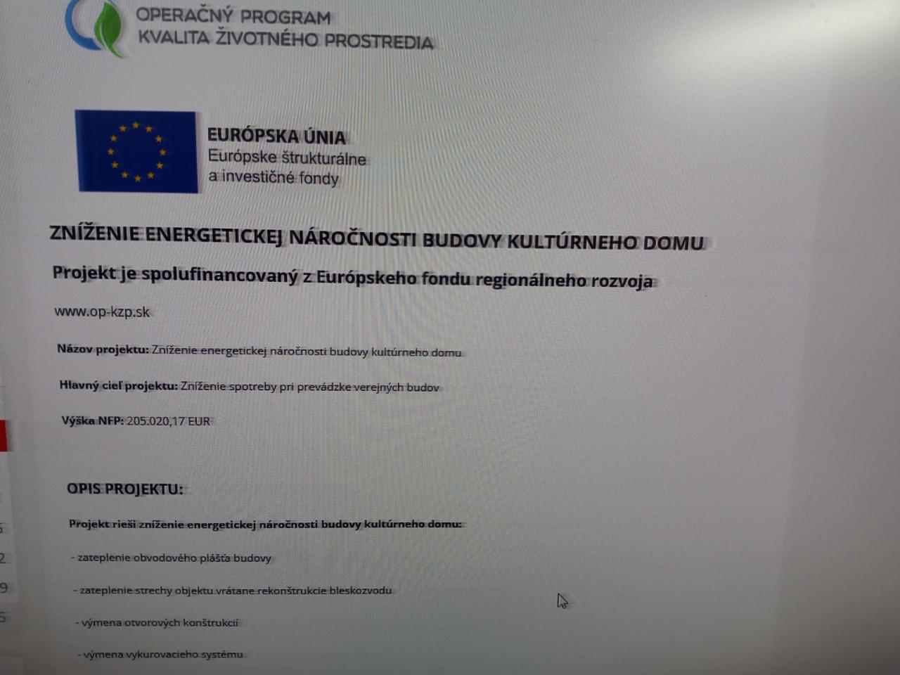 Názov projektu: Zníženie energetickej náročnosti budovy kultúrneho domu